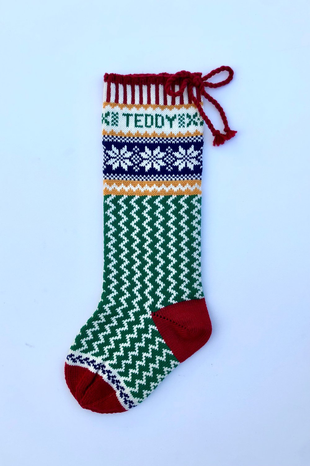 Heirloom Nordic Star Christmas Stocking. Made in America, of American wool. Our Traditional Scandinavian style Christmas Stocking designs are knit in five bold colors. Please order by choosing the main leg color. The remaining detail colors will be designed to best compliment that choice. If you already have other stockings, or you are ordering a group, feel free to email and send photos and we will knit what looks best with your existing group or the rest of your order. All of our Christmas stockings are designed and knit in Pennsylvania and can be personalized up to 9 characters. Non-personalized Christmas Stockings can be passed down as heirlooms from generation to generation.
